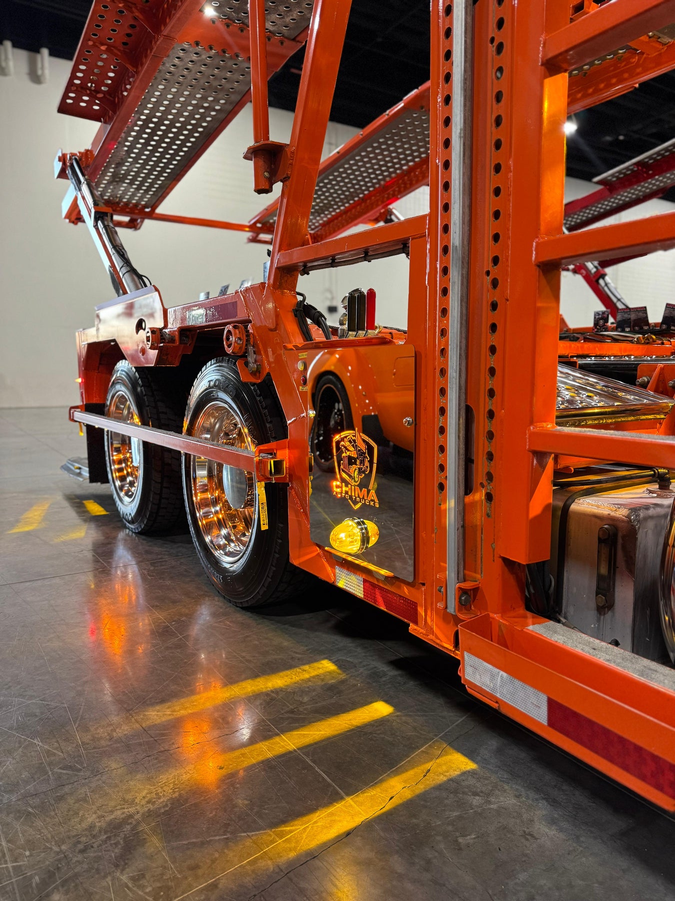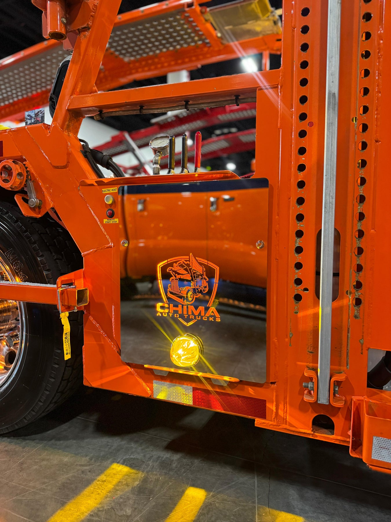 Custom stainless steel hydraulic panel plate with integrated LED backlighting and precision cutout for watermelon light mounting. Designed for clean installation below hydraulic control levers on car hauler setups. Built for durability and show-quality appearance.