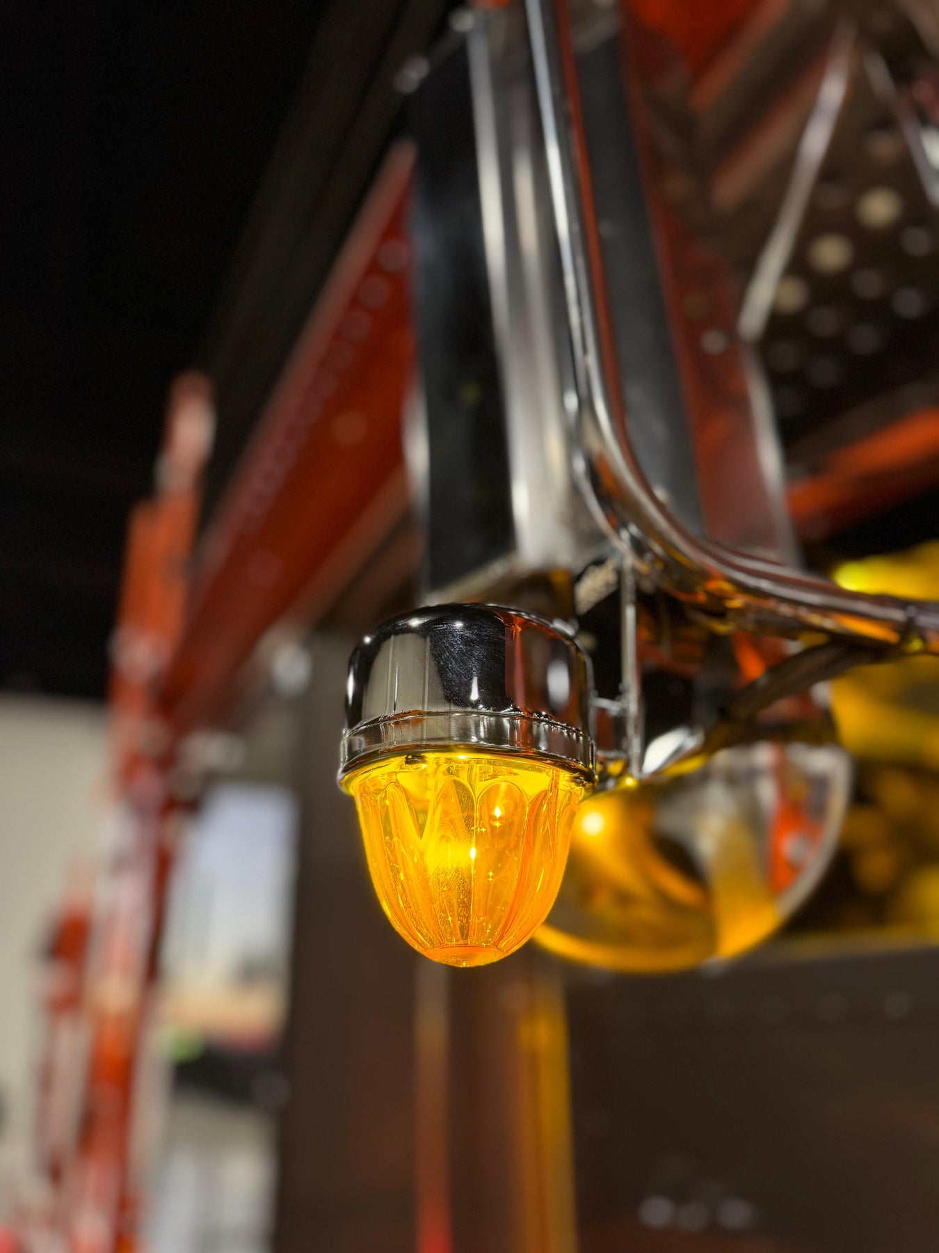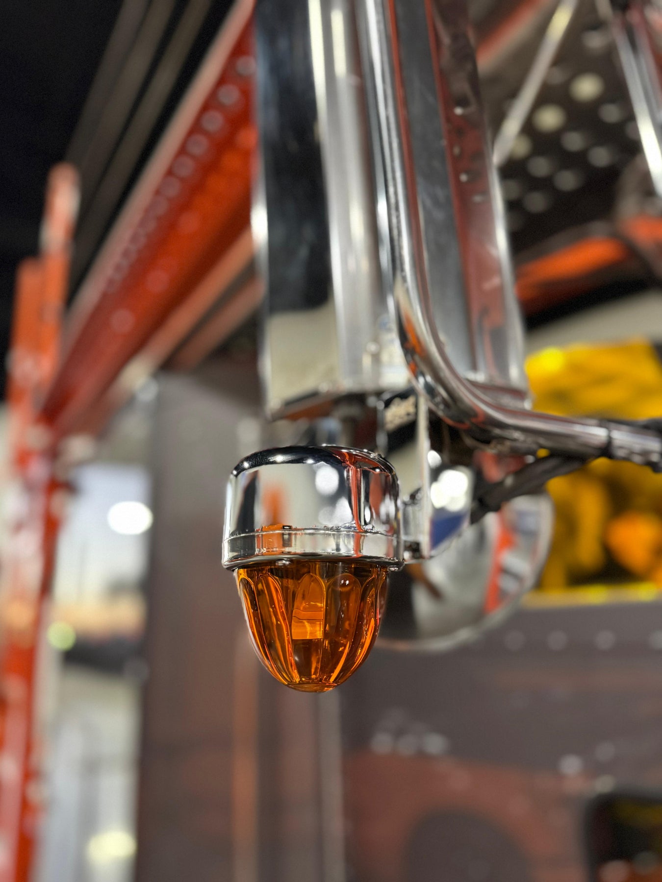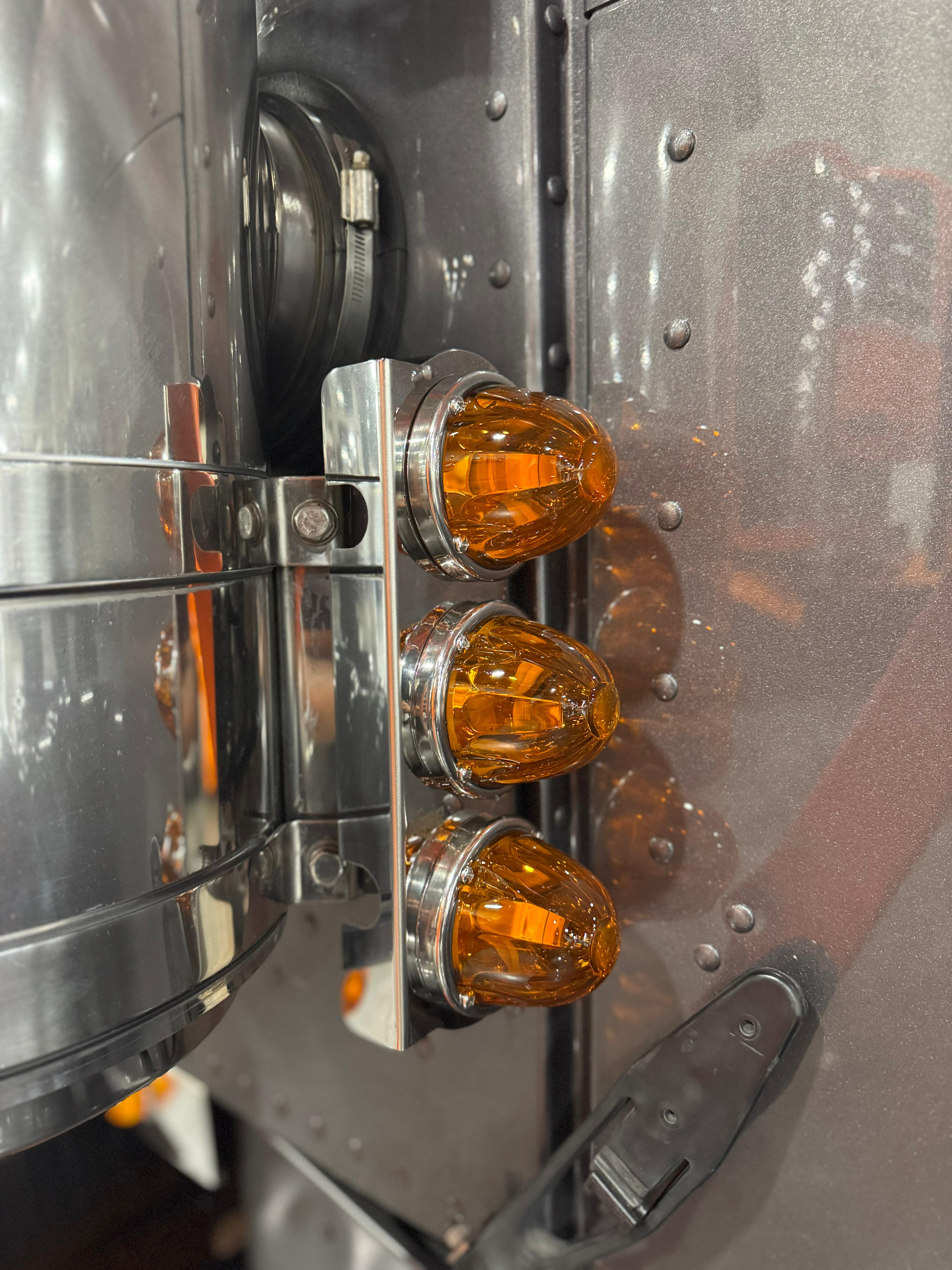 Polished stainless steel mirror-mounted bracket designed for watermelon light installation. Clean, low-profile design with durable mounting construction for show and custom truck builds. Compatible with Peterbilt 389 mirror assemblies. Provides secure fitment and professional appearance.